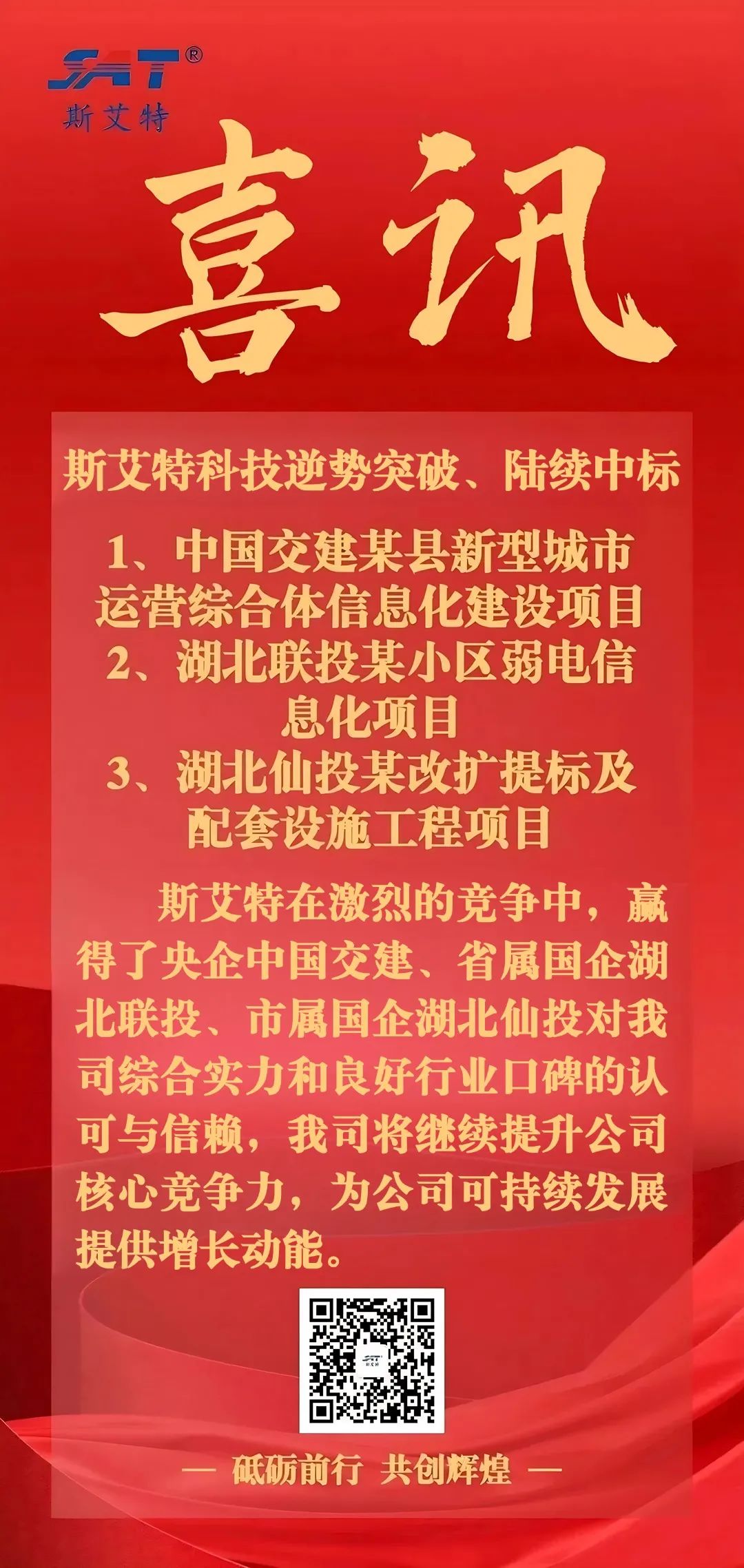 斯艾特科技成功中標央企中國交建、省屬國企湖北聯投、市屬國企湖北仙投三大項目